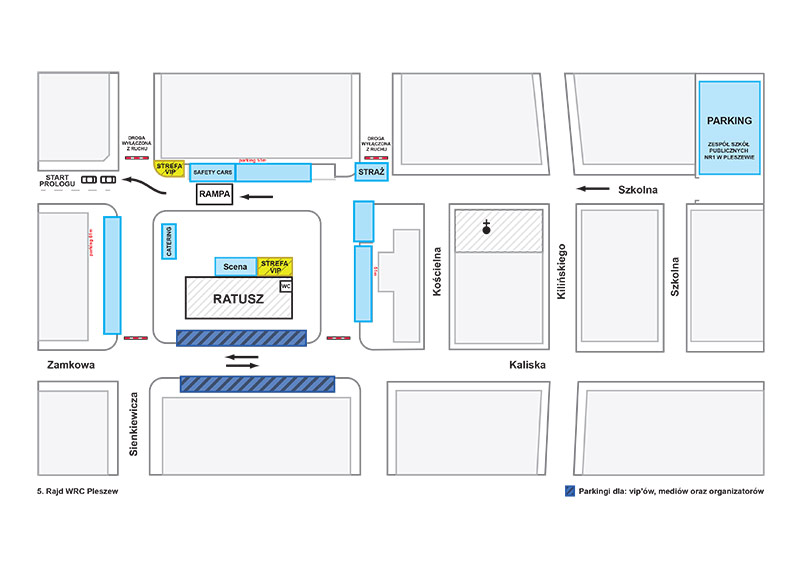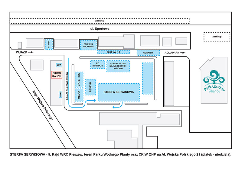 Strefa serwisowa wraz z miasteczkiem rajdowym zostanie zlokalizowana na terenie Parku Wodnego Planty oraz CKiW OHP na ul. Wojska Polskiego 21 .