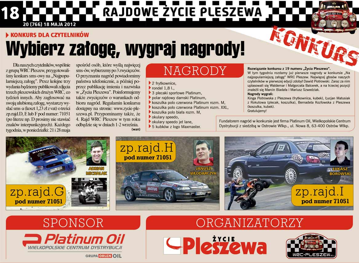 Zakończył się konkurs na „Na najpopularniejszą załogę” WRC Pleszew. Najwięcej głosów ze wszystkich trzech edycji zdobył Maciej Jakubowski, tuż za min uplasował się Adam Walczak, a na trzeciej pozycji zmalał się Dawid Piotrowski.