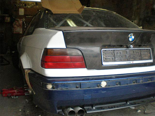 Praktycznie prawie miesiąc czasu pochłonęła kosmetyka pojazdu, tylna szyba jak i drzwi zostały zastąpione poliwęglanem, drzwi, tylna klapa zostały maksymalnie odchudzone. Samochód zyskał nowy design kolorystyczny no i oczywiście nie zabrakło oryginalnego pakietu M, myślę, że wprawne oko wielbicieli marki BMW zauważy customowe błotniki z laminatu oraz poszerzenia tylnych błotników. Rozstaw kół został poszerzony o 6cm, a dodatkowo zastosowanie felgi z ET15 dało mi całkowite poszerzenie rozstawu kół na poziomie 12cm.
